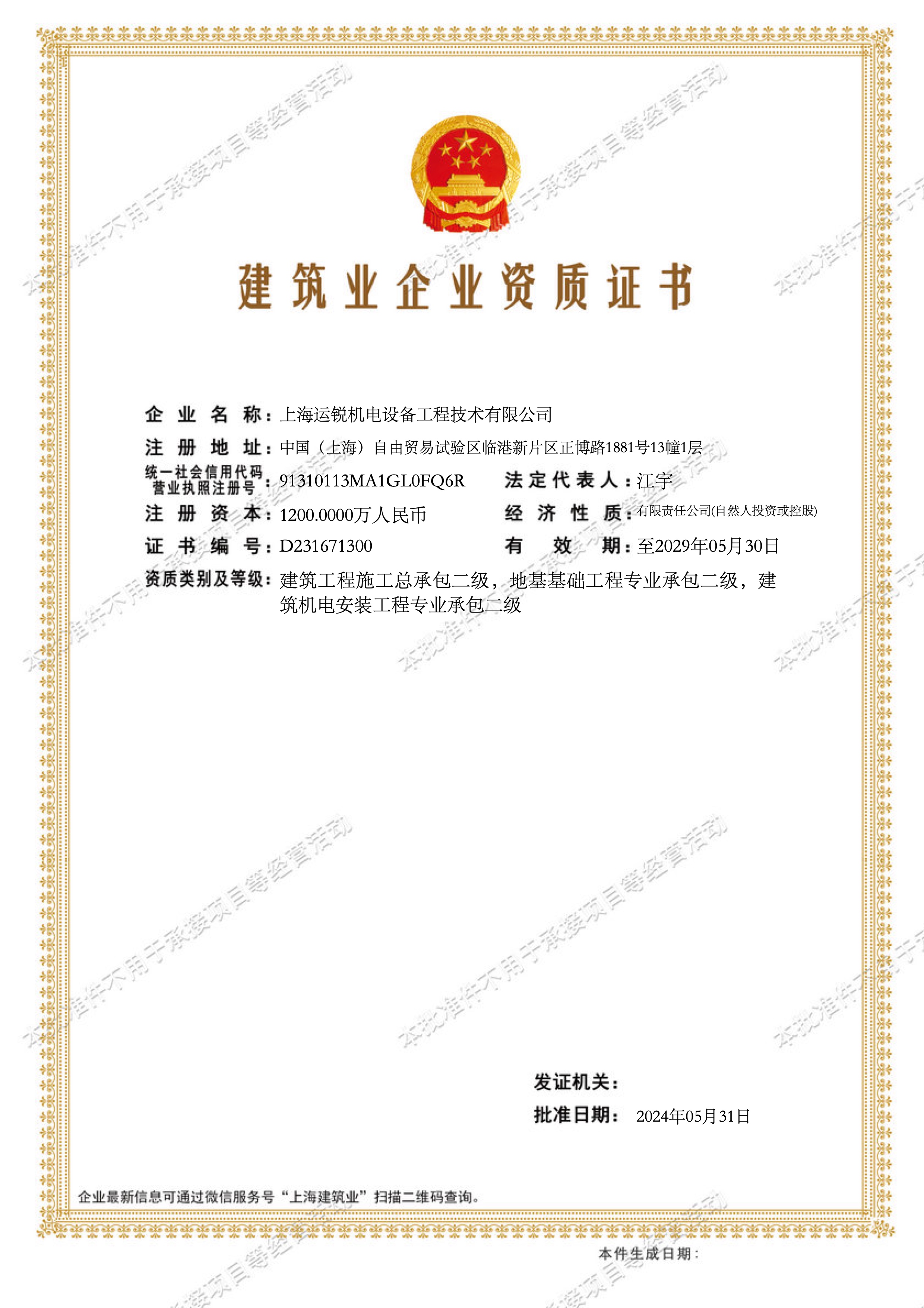 尊龙凯时获批上海住建委颁发的建筑业企业资质证书,成为行业内唯一同时具备建筑工程施工总承包资质、钢结构制作与安装专业承包资质,地基基础工程专业承包资质、建筑机电安装工程专业承包资质的设备生产厂家。并获得质量管理体系认证、环境管理体系认证、职业健康安全管理体系认证等三体系认证。